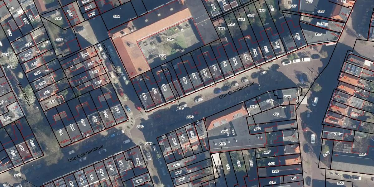 Drie Octoberstraat 25 is gelegen op kadastraal perceel LDN01M3096. Deze kadastrale aanduiding is uniek en wordt gebruikt door het Kadaster om eigendomsrechten en andere zakelijke rechten vast te leggen. Het perceel maakt onderdeel uit van de kadastrale gemeente Leiden.