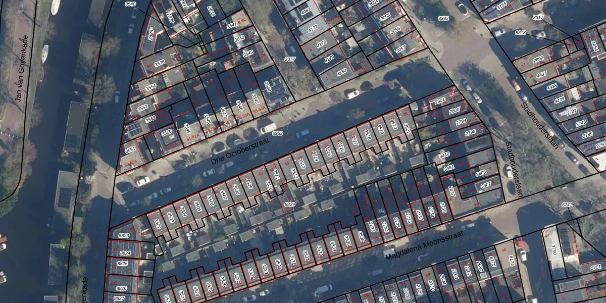 Drie Octoberstraat 44 is gelegen op kadastraal perceel LDN01M3513. Deze kadastrale aanduiding is uniek en wordt gebruikt door het Kadaster om eigendomsrechten en andere zakelijke rechten vast te leggen. Het perceel maakt onderdeel uit van de kadastrale gemeente Leiden.