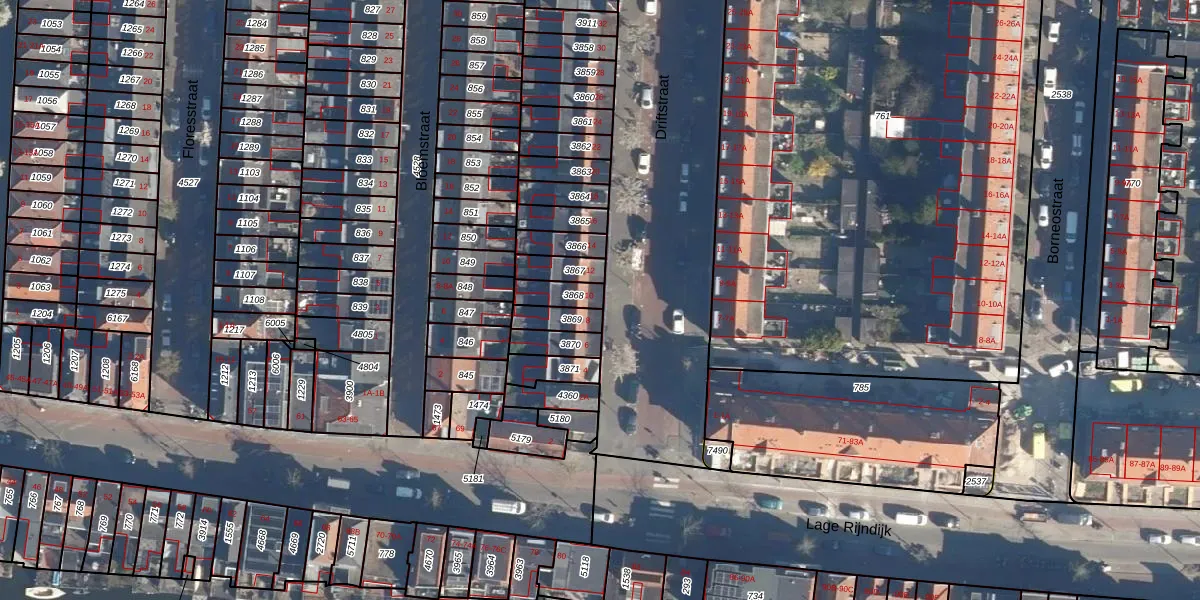 Het perceel waarop Driftstraat 10 staat heeft een oppervlakte van 63 m². Dit is een klein perceel. De perceeloppervlakte wordt geregistreerd door het Kadaster. Gedetailleerde informatie over de maten van dit perceel kunt u vinden in het rapport Kadastrale kaart met maatvoering van Driftstraat 10.