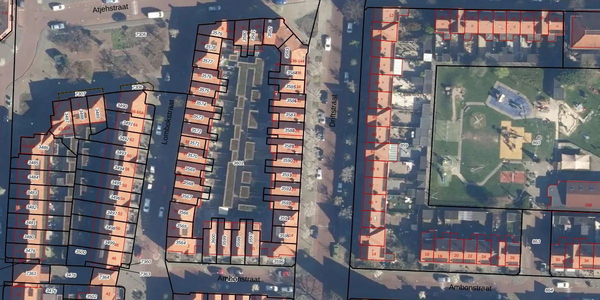 Gebruik de zoekbalk of klik op een perceel voor informatie over de adressen binnen dit perceel.