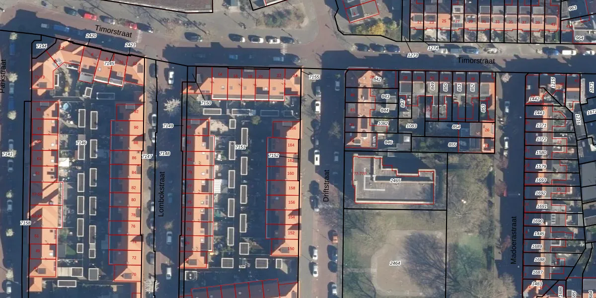 Het perceel waarop Driftstraat 164 staat heeft een oppervlakte van 3224 m². Dit is een zeer groot perceel. De perceeloppervlakte wordt geregistreerd door het Kadaster. Gedetailleerde informatie over de maten van dit perceel kunt u vinden in het rapport Kadastrale kaart met maatvoering van Driftstraat 164.