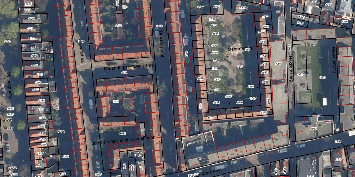 Druckerstraat 24-A is gelegen op kadastraal perceel LDN01H3635. Deze kadastrale aanduiding is uniek en wordt gebruikt door het Kadaster om eigendomsrechten en andere zakelijke rechten vast te leggen. Het perceel maakt onderdeel uit van de kadastrale gemeente Leiden.