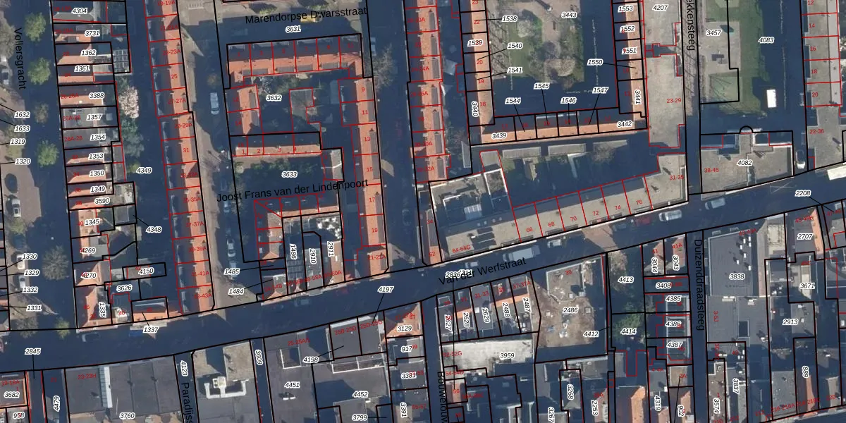 Het perceel waarop het adres ligt is LDN01-H-3635. De afkorting 'LDN01' staat voor kadastrale gemeente Leiden. De gemiddelde perceeloppervlakte in de kadastrale gemeente Leiden is 704,95 m². Dit perceel is met zijn 1353 m² dus groter dan gemiddeld. Het kleinste perceel in de kadastrale gemeente is 0 m² groot. De grootste perceeloppervlakte is 51,8 ha. Op het perceel zijn 30 adressen aanwezig. De huidige grenzen van het perceel zijn digitaal in de Basisregistratie Kadaster (BRK) geregistreerd op 19-07-1999.