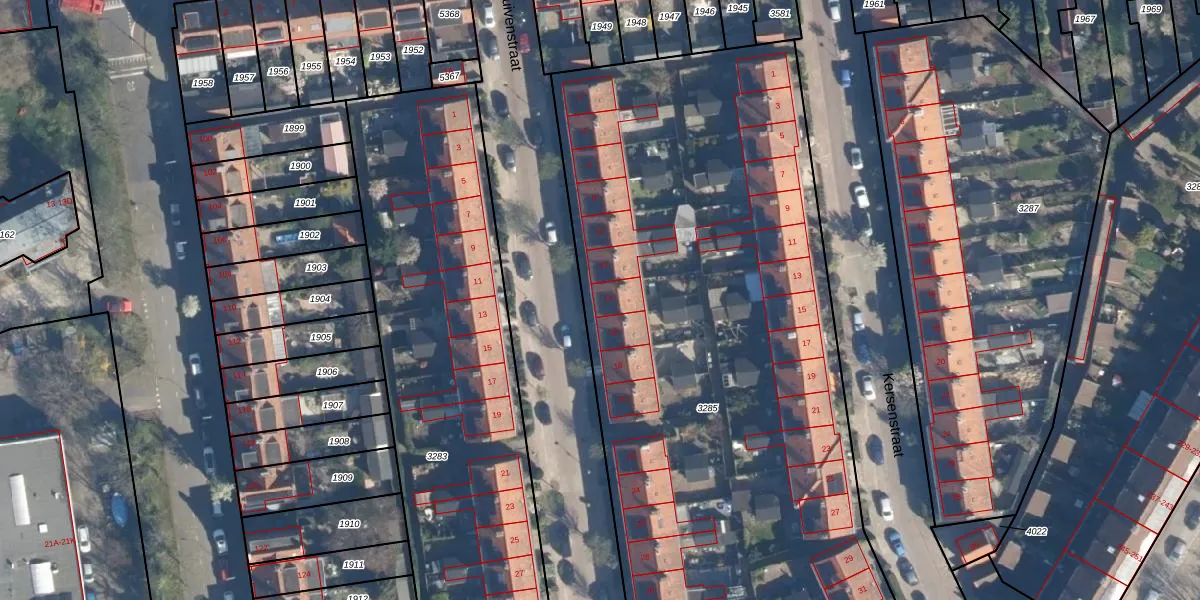 Druivenstraat 14 is gelegen op kadastraal perceel LDN01O3285. Deze kadastrale aanduiding is uniek en wordt gebruikt door het Kadaster om eigendomsrechten en andere zakelijke rechten vast te leggen. Het perceel maakt onderdeel uit van de kadastrale gemeente Leiden.