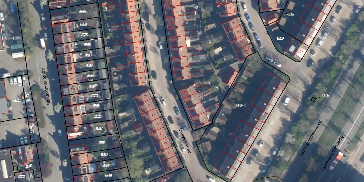 Druivenstraat 40 is gelegen op kadastraal perceel LDN01O3285. Deze kadastrale aanduiding is uniek en wordt gebruikt door het Kadaster om eigendomsrechten en andere zakelijke rechten vast te leggen. Het perceel maakt onderdeel uit van de kadastrale gemeente Leiden.