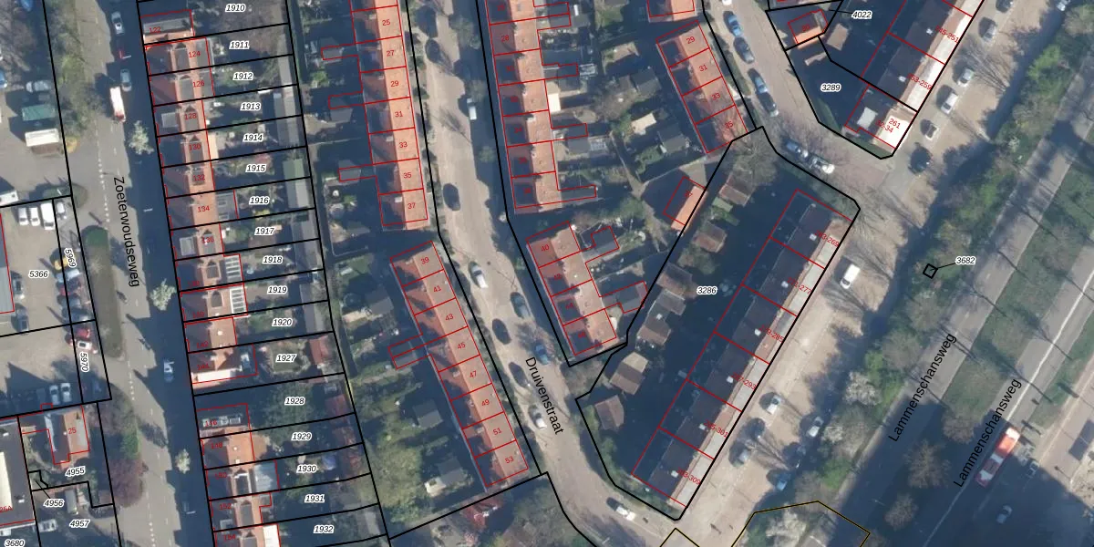 Druivenstraat 42 is gelegen op kadastraal perceel LDN01O3285. Deze kadastrale aanduiding is uniek en wordt gebruikt door het Kadaster om eigendomsrechten en andere zakelijke rechten vast te leggen. Het perceel maakt onderdeel uit van de kadastrale gemeente Leiden.