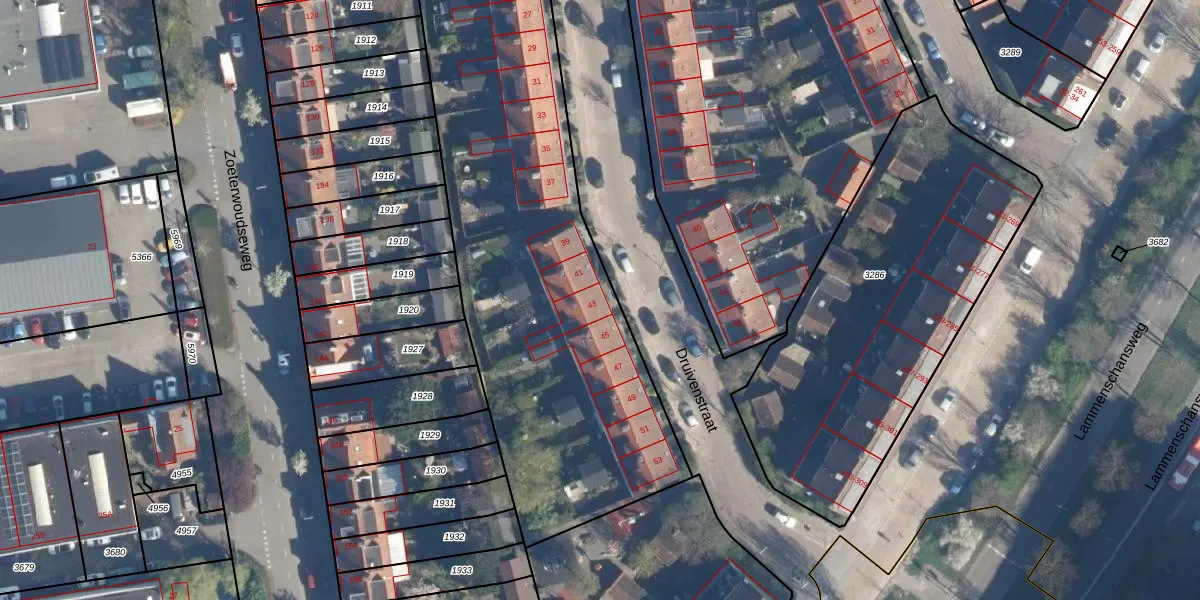 Het perceel waarop Druivenstraat 43 staat heeft een oppervlakte van 3890 m². Dit is een zeer groot perceel. De perceeloppervlakte wordt geregistreerd door het Kadaster. Gedetailleerde informatie over de maten van dit perceel kunt u vinden in het rapport Kadastrale kaart met maatvoering van Druivenstraat 43.