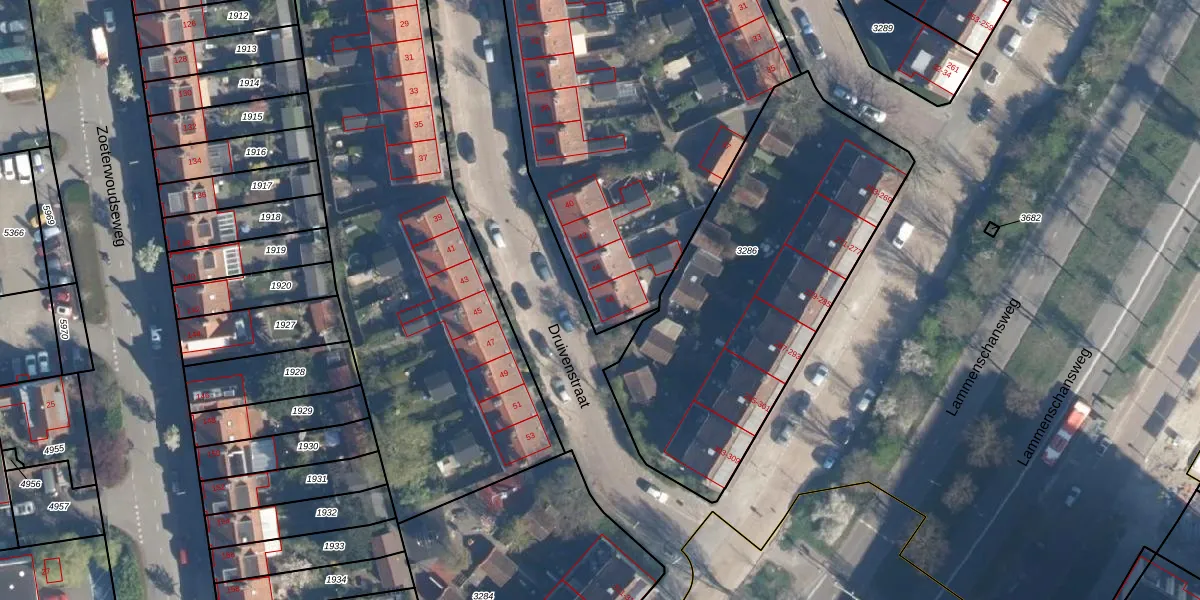 Druivenstraat 46 is gelegen op kadastraal perceel LDN01O3285. Deze kadastrale aanduiding is uniek en wordt gebruikt door het Kadaster om eigendomsrechten en andere zakelijke rechten vast te leggen. Het perceel maakt onderdeel uit van de kadastrale gemeente Leiden.