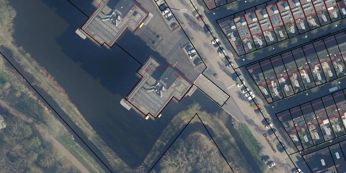 Het perceel waarop Drususlaan 183 staat heeft een oppervlakte van 5461 m². Dit is een zeer groot perceel. De perceeloppervlakte wordt geregistreerd door het Kadaster. Gedetailleerde informatie over de maten van dit perceel kunt u vinden in het rapport Kadastrale kaart met maatvoering van Drususlaan 183.