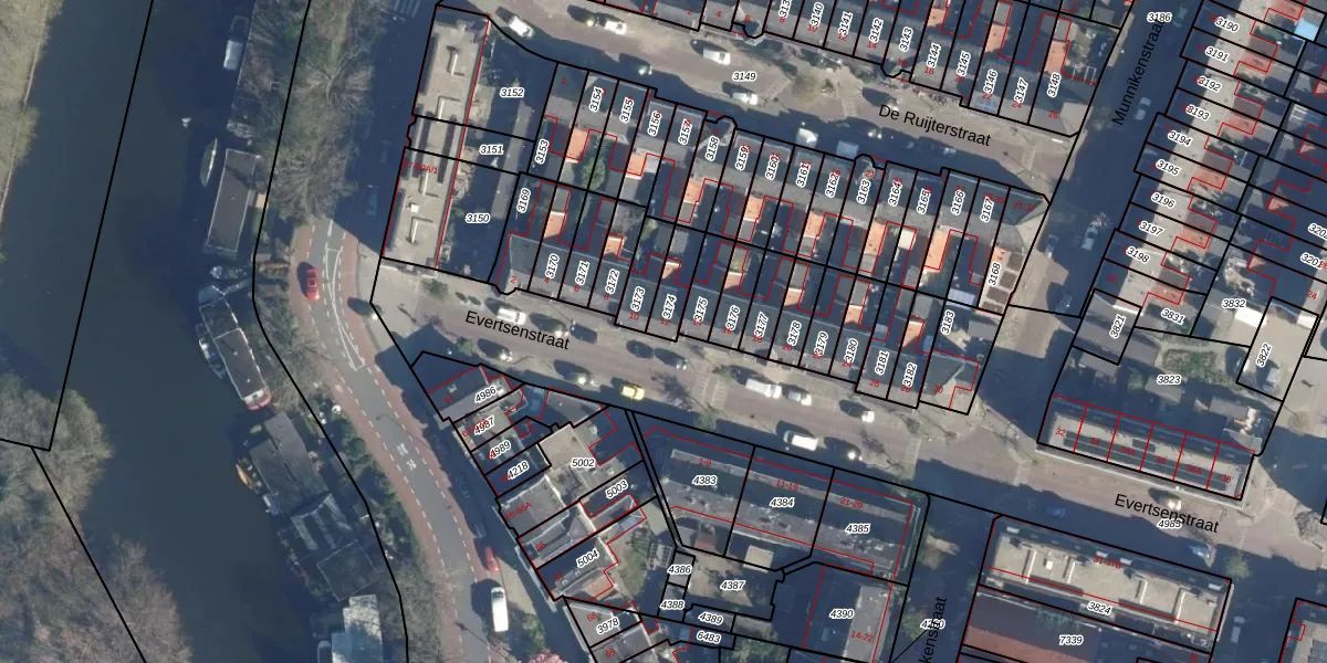 Het perceel waarop Evertsenstraat 12 staat heeft een oppervlakte van 80 m². Dit is een klein perceel. De perceeloppervlakte wordt geregistreerd door het Kadaster. Gedetailleerde informatie over de maten van dit perceel kunt u vinden in het rapport Kadastrale kaart met maatvoering van Evertsenstraat 12.