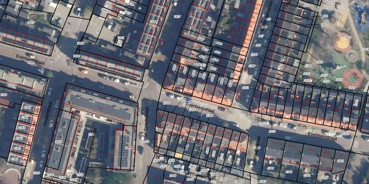 Het perceel waarop Evertsenstraat 54 staat heeft een oppervlakte van 80 m². Dit is een klein perceel. De perceeloppervlakte wordt geregistreerd door het Kadaster. Gedetailleerde informatie over de maten van dit perceel kunt u vinden in het rapport Kadastrale kaart met maatvoering van Evertsenstraat 54.