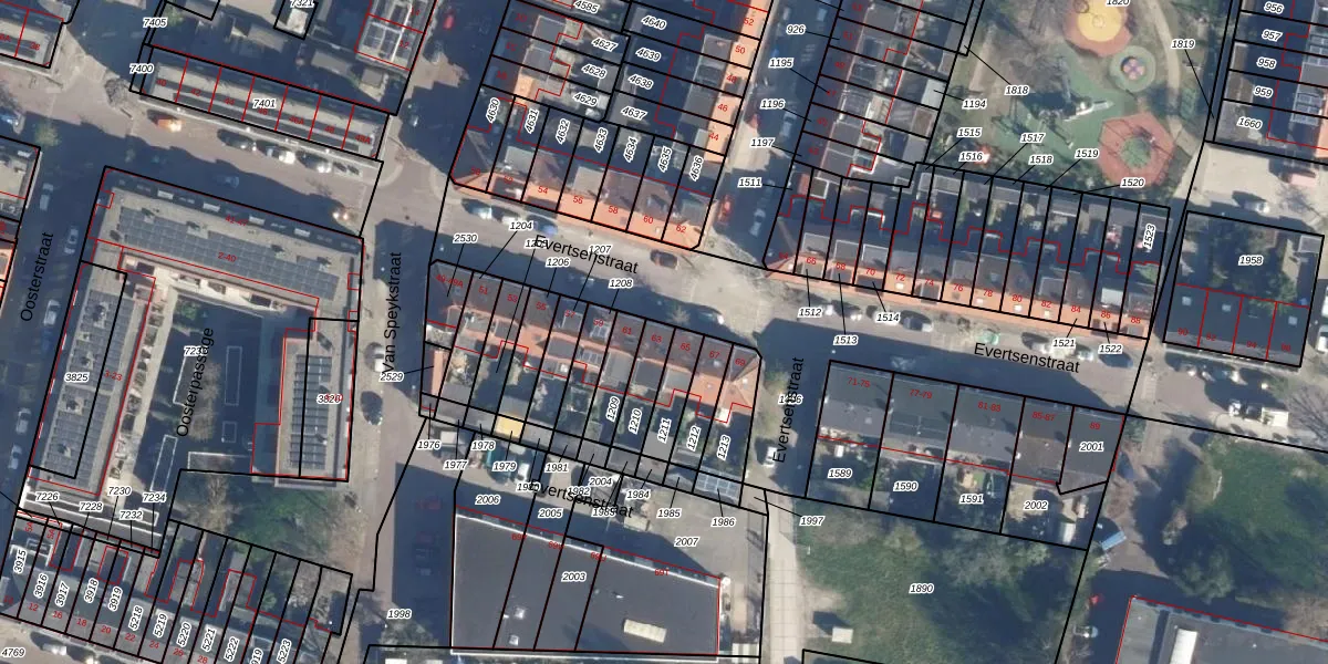 Het perceel waarop Evertsenstraat 63 staat heeft een oppervlakte van 90 m². Dit is een klein perceel. De perceeloppervlakte wordt geregistreerd door het Kadaster. Gedetailleerde informatie over de maten van dit perceel kunt u vinden in het rapport Kadastrale kaart met maatvoering van Evertsenstraat 63.