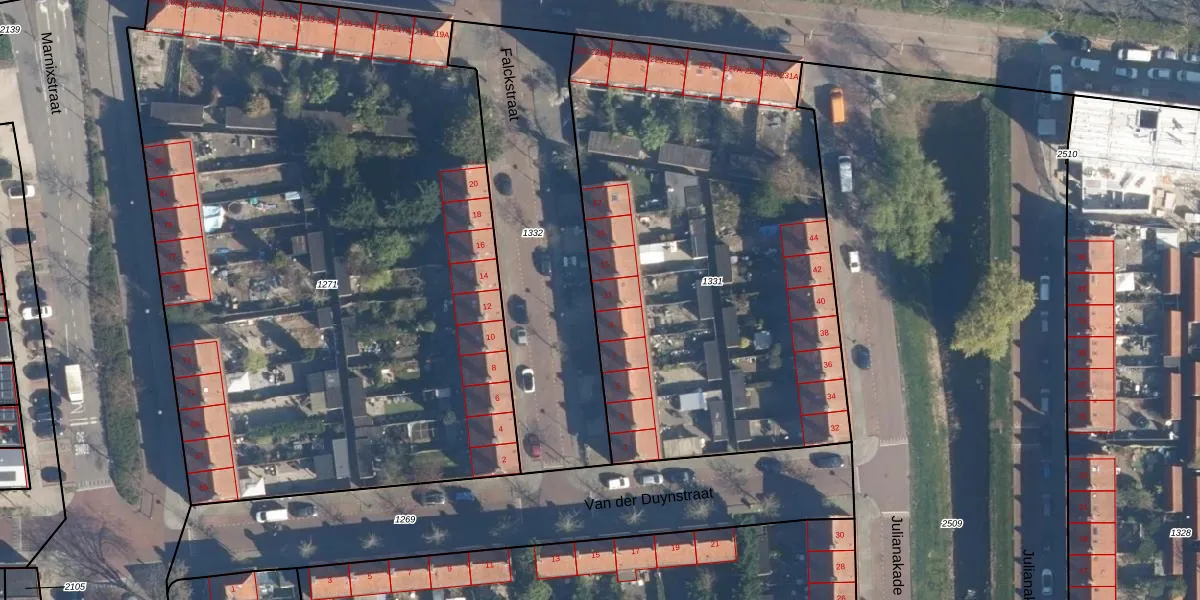 Het perceel waarop Falckstraat 11 staat heeft een oppervlakte van 2710 m². Dit is een zeer groot perceel. De perceeloppervlakte wordt geregistreerd door het Kadaster. Gedetailleerde informatie over de maten van dit perceel kunt u vinden in het rapport Kadastrale kaart met maatvoering van Falckstraat 11.