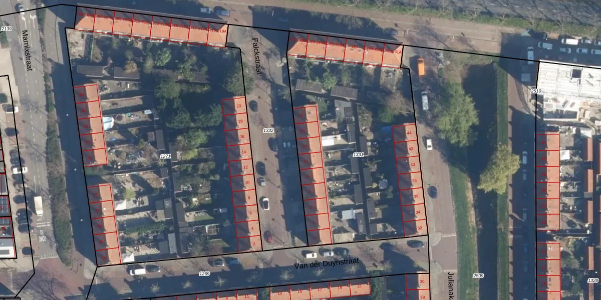 Het perceel waarop Falckstraat 13 staat heeft een oppervlakte van 2710 m². Dit is een zeer groot perceel. De perceeloppervlakte wordt geregistreerd door het Kadaster. Gedetailleerde informatie over de maten van dit perceel kunt u vinden in het rapport Kadastrale kaart met maatvoering van Falckstraat 13.