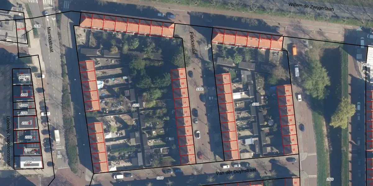 Het perceel waarop Falckstraat 16 staat heeft een oppervlakte van 4545 m². Dit is een zeer groot perceel. De perceeloppervlakte wordt geregistreerd door het Kadaster. Gedetailleerde informatie over de maten van dit perceel kunt u vinden in het rapport Kadastrale kaart met maatvoering van Falckstraat 16.