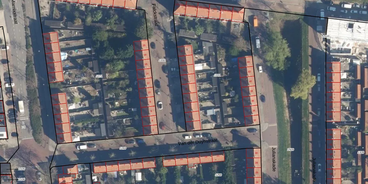 Het perceel waarop Falckstraat 9 staat heeft een oppervlakte van 2710 m². Dit is een zeer groot perceel. De perceeloppervlakte wordt geregistreerd door het Kadaster. Gedetailleerde informatie over de maten van dit perceel kunt u vinden in het rapport Kadastrale kaart met maatvoering van Falckstraat 9.