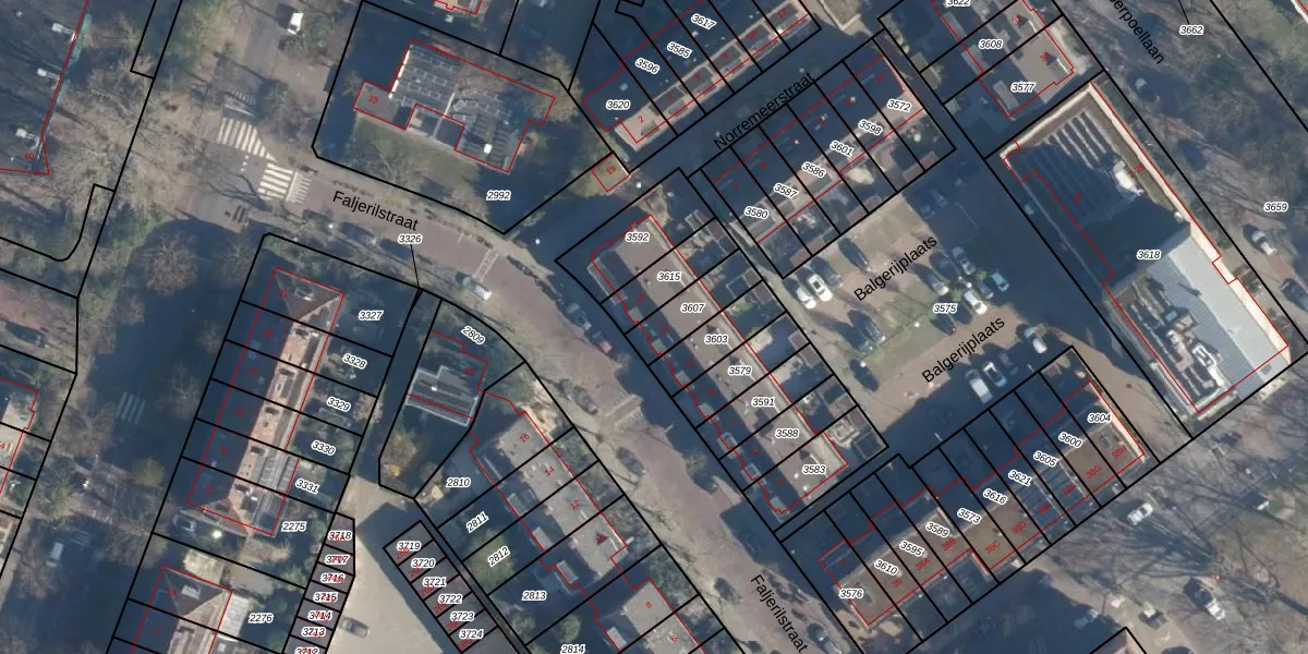 Faljerilstraat 13 is gelegen op kadastraal perceel LDN01P3607. Deze kadastrale aanduiding is uniek en wordt gebruikt door het Kadaster om eigendomsrechten en andere zakelijke rechten vast te leggen. Het perceel maakt onderdeel uit van de kadastrale gemeente Leiden.