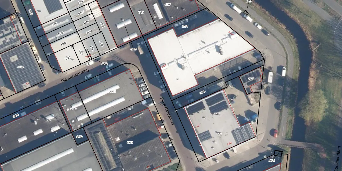 Het perceel waarop Flevodwarsweg 3 staat heeft een oppervlakte van 2093 m². Dit is een zeer groot perceel. De perceeloppervlakte wordt geregistreerd door het Kadaster. Gedetailleerde informatie over de maten van dit perceel kunt u vinden in het rapport Kadastrale kaart met maatvoering van Flevodwarsweg 3.
