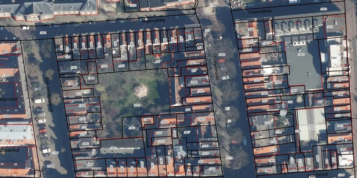 Het perceel waarop Garenmarkt 9-A staat heeft een oppervlakte van 1306 m². Dit is een zeer groot perceel. De perceeloppervlakte wordt geregistreerd door het Kadaster. Gedetailleerde informatie over de maten van dit perceel kunt u vinden in het rapport Kadastrale kaart met maatvoering van Garenmarkt 9-A.