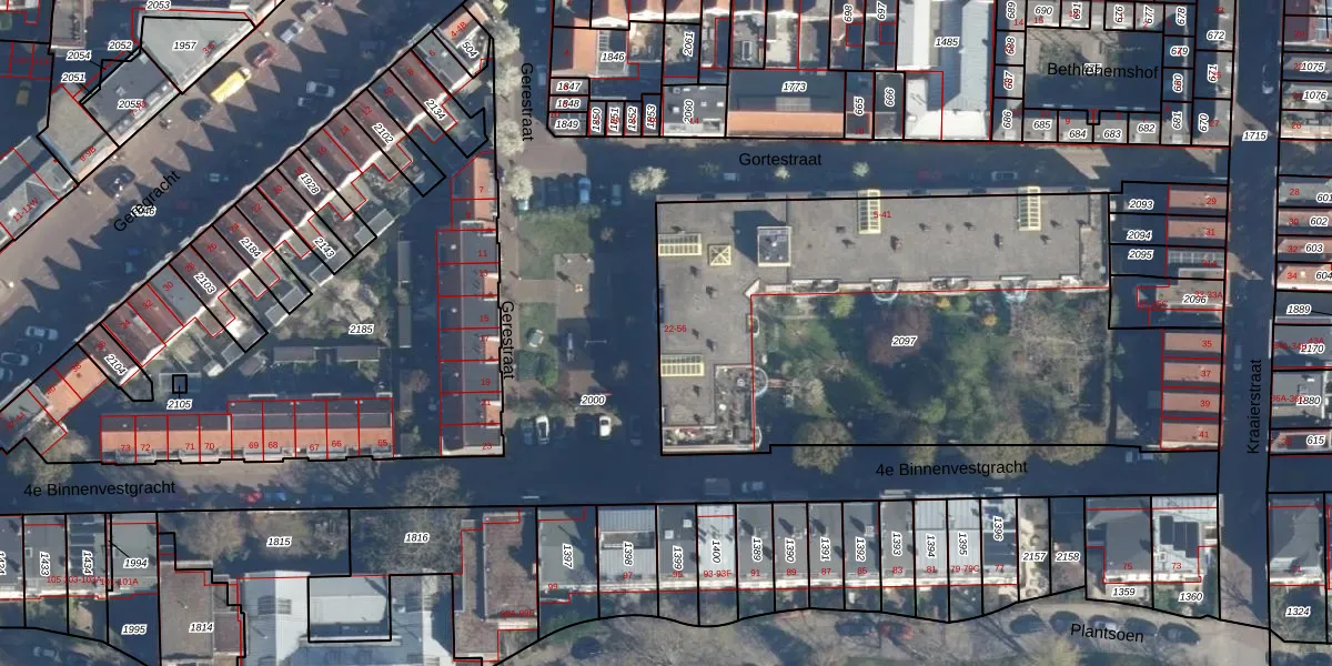 Gerestraat 32 is gelegen op kadastraal perceel LDN01E2097. Deze kadastrale aanduiding is uniek en wordt gebruikt door het Kadaster om eigendomsrechten en andere zakelijke rechten vast te leggen. Het perceel maakt onderdeel uit van de kadastrale gemeente Leiden.