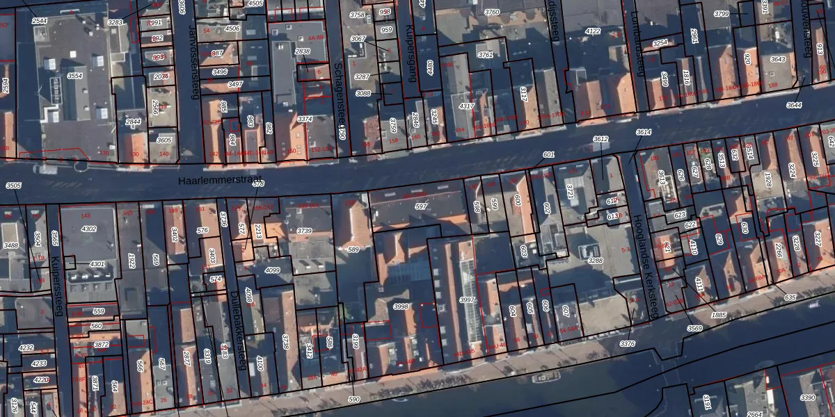 Haarlemmerstraat 165 is gelegen op kadastraal perceel LDN01H597. Deze kadastrale aanduiding is uniek en wordt gebruikt door het Kadaster om eigendomsrechten en andere zakelijke rechten vast te leggen. Het perceel maakt onderdeel uit van de kadastrale gemeente Leiden.