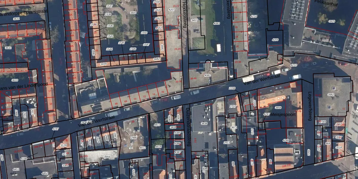 Het perceel waarop het adres ligt is LDN01-H-4207. De afkorting 'LDN01' staat voor kadastrale gemeente Leiden. Het perceel is met 1874 m² relatief groot. Het gemiddelde ligt in de kadastrale gemeente Leiden op 703,94 m². Het kleinste perceel in de kadastrale gemeente is 0 m² groot. De grootste perceeloppervlakte is 51,8 ha. Op het perceel zijn 28 adressen aanwezig. De huidige grenzen van het perceel zijn digitaal in de Basisregistratie Kadaster (BRK) geregistreerd op 19-07-1999.