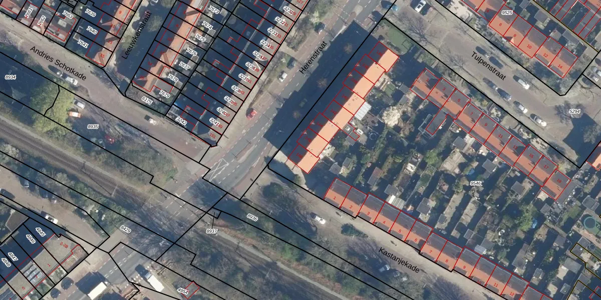 Het perceel waarop het adres ligt is LDN01-M-9546. De afkorting 'LDN01' staat voor kadastrale gemeente Leiden. Het perceel is met 6737 m² relatief groot. Het gemiddelde ligt in de kadastrale gemeente Leiden op 703,94 m². De grootste perceeloppervlakte in de kadastrale gemeente is 51,8 ha. De kleinste oppervlakte bedraagt 0 m². Op het perceel liggen in totaal 41 adressen. De huidige grenzen van het perceel zijn digitaal in de Basisregistratie Kadaster (BRK) geregistreerd op 16-10-2024.