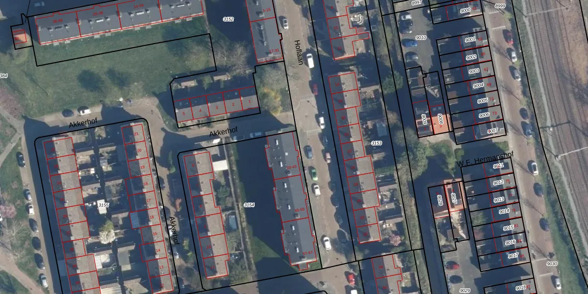 Hoflaan 33 is gelegen op kadastraal perceel LDN01O3154. Deze kadastrale aanduiding is uniek en wordt gebruikt door het Kadaster om eigendomsrechten en andere zakelijke rechten vast te leggen. Het perceel maakt onderdeel uit van de kadastrale gemeente Leiden.