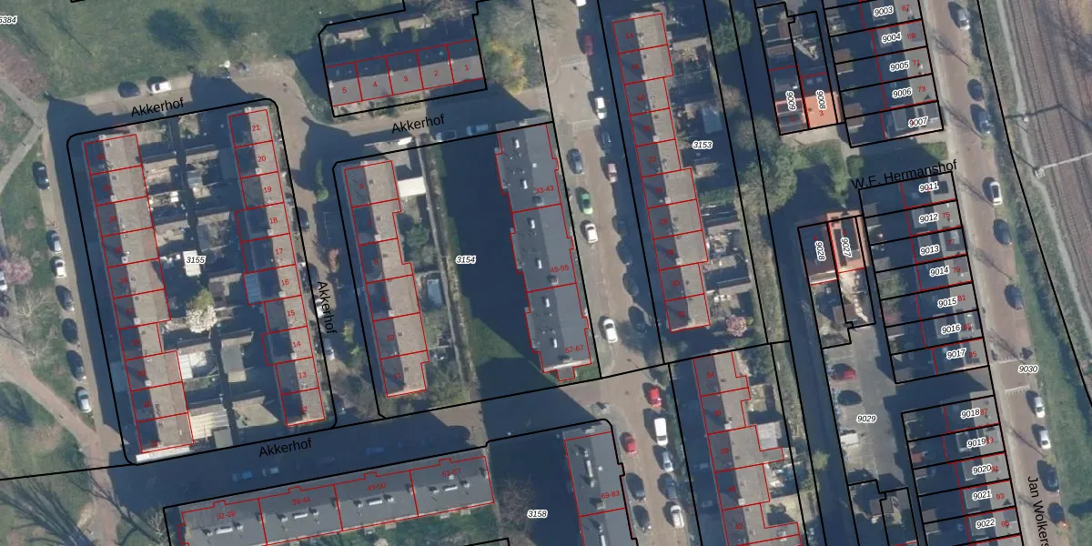 Het perceel waarop het adres ligt is LDN01-O-3154. De afkorting 'LDN01' staat voor kadastrale gemeente Leiden. Het perceel is met 1970 m² relatief groot. Het gemiddelde ligt in de kadastrale gemeente Leiden op 703,94 m². De grootste perceeloppervlakte in de kadastrale gemeente is 51,8 ha. De kleinste oppervlakte bedraagt 0 m². Er zijn 24 adressen aanwezig op het perceel. De laatste wijziging in het de Basisregistratie Kadaster (BRK) was op 06-08-2003.