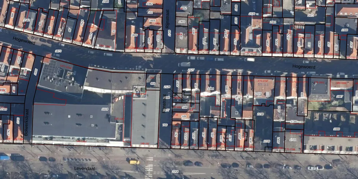 Hogewoerd 155-B is gelegen op kadastraal perceel LDN01D2097. Deze kadastrale aanduiding is uniek en wordt gebruikt door het Kadaster om eigendomsrechten en andere zakelijke rechten vast te leggen. Het perceel maakt onderdeel uit van de kadastrale gemeente Leiden.