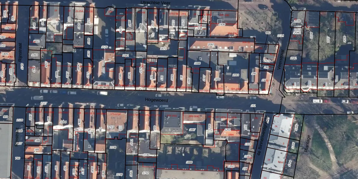 Het perceel waarop Hogewoerd 158 staat heeft een oppervlakte van 174 m². Dit is een middelgroot perceel. De perceeloppervlakte wordt geregistreerd door het Kadaster. Gedetailleerde informatie over de maten van dit perceel kunt u vinden in het rapport Kadastrale kaart met maatvoering van Hogewoerd 158.