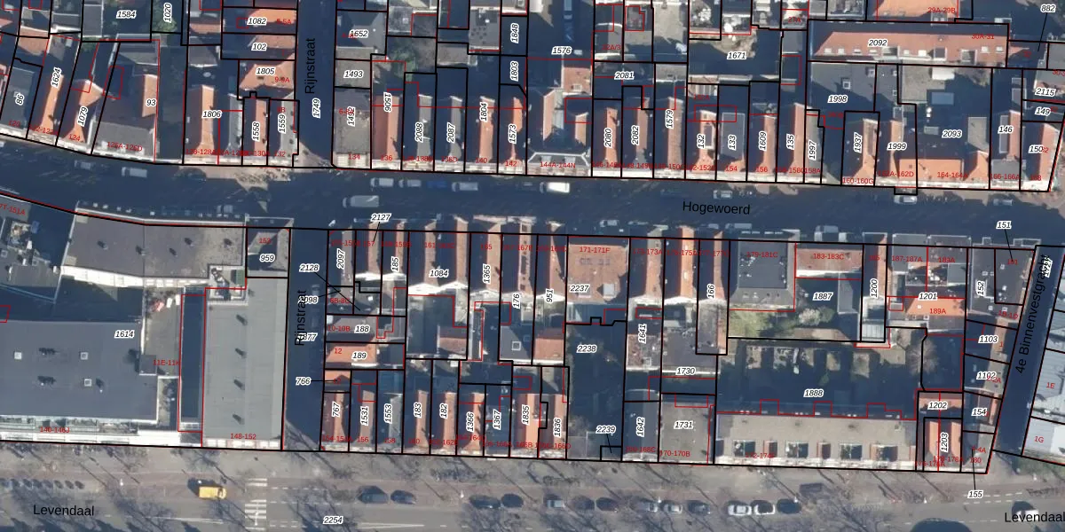 Hogewoerd 167-B is gelegen op kadastraal perceel LDN01D176. Deze kadastrale aanduiding is uniek en wordt gebruikt door het Kadaster om eigendomsrechten en andere zakelijke rechten vast te leggen. Het perceel maakt onderdeel uit van de kadastrale gemeente Leiden.