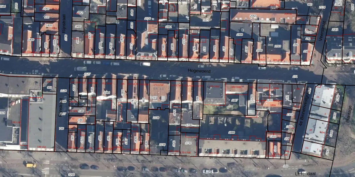 Het perceel waarop Hogewoerd 173-A staat heeft een oppervlakte van 188 m². Dit is een middelgroot perceel. De perceeloppervlakte wordt geregistreerd door het Kadaster. Gedetailleerde informatie over de maten van dit perceel kunt u vinden in het rapport Kadastrale kaart met maatvoering van Hogewoerd 173-A.