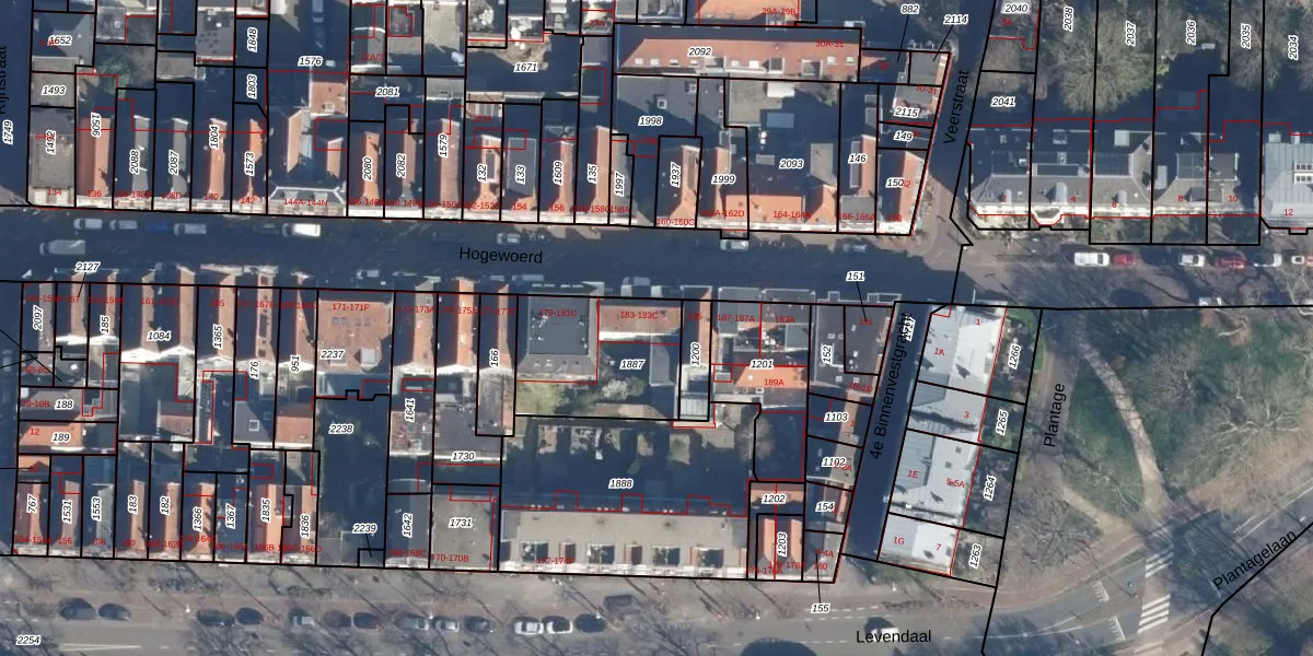 Hogewoerd 183-B is gelegen op kadastraal perceel LDN01D1887. Deze kadastrale aanduiding is uniek en wordt gebruikt door het Kadaster om eigendomsrechten en andere zakelijke rechten vast te leggen. Het perceel maakt onderdeel uit van de kadastrale gemeente Leiden.