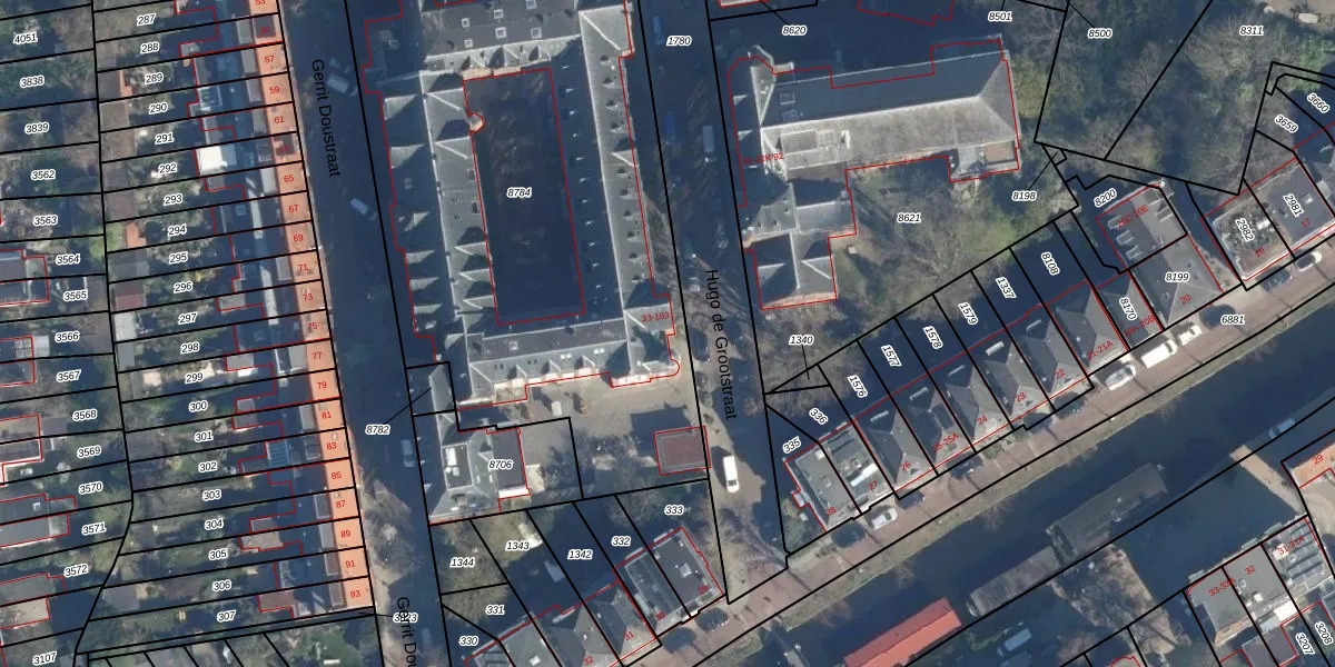 Hugo de Grootstraat 107 is gelegen op kadastraal perceel LDN01M8784. Deze kadastrale aanduiding is uniek en wordt gebruikt door het Kadaster om eigendomsrechten en andere zakelijke rechten vast te leggen. Het perceel maakt onderdeel uit van de kadastrale gemeente Leiden.