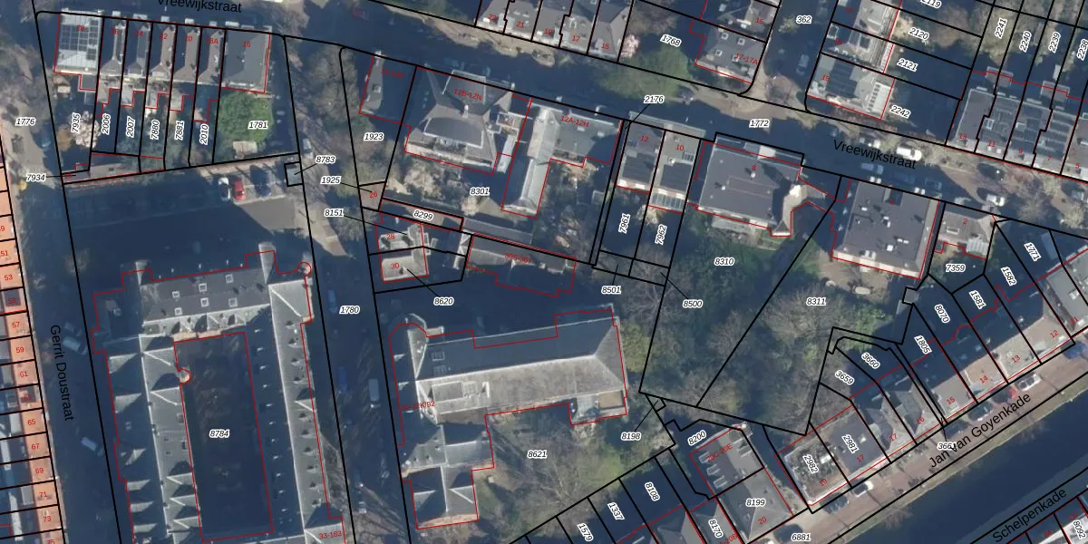 Het perceel waarop het adres ligt is LDN01-M-8621. De afkorting 'LDN01' staat voor kadastrale gemeente Leiden. De oppervlakte van het perceel is 2326 m². Dat is groter dan gemiddeld in Leiden, waar de gemiddelde perceeloppervlakte op 703,94 m² ligt. De grootste perceeloppervlakte in de kadastrale gemeente is 51,8 ha. De kleinste oppervlakte bedraagt 0 m². Op het perceel liggen in totaal 32 adressen. De laatste wijziging in het de Basisregistratie Kadaster (BRK) was op 28-08-2003.