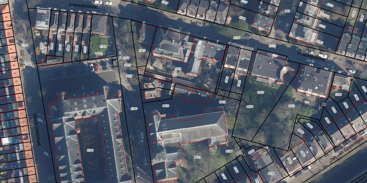 Het perceel waarop het adres ligt is LDN01-M-8621. De afkorting 'LDN01' staat voor kadastrale gemeente Leiden. De oppervlakte van het perceel is 2326 m². Dat is groter dan gemiddeld in Leiden, waar de gemiddelde perceeloppervlakte op 703,94 m² ligt. De grootste perceeloppervlakte in de kadastrale gemeente is 51,8 ha. De kleinste oppervlakte bedraagt 0 m². Op het perceel liggen in totaal 32 adressen. In de Basisregistratie Kadaster (BRK) werden de grenzen van het perceel geregistreerd op 28-08-2003.