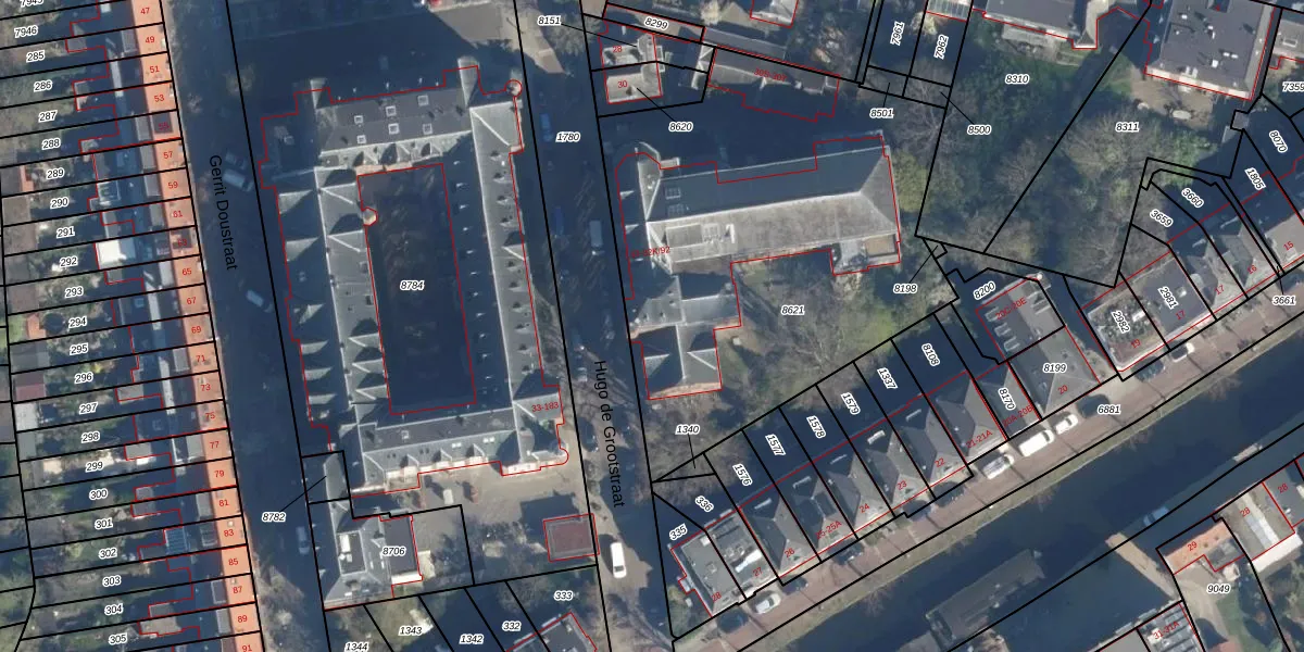 Het perceel waarop het adres ligt is LDN01-M-8621. De afkorting 'LDN01' staat voor kadastrale gemeente Leiden. De oppervlakte van het perceel is 2326 m². Dat is groter dan gemiddeld in Leiden, waar de gemiddelde perceeloppervlakte op 703,94 m² ligt. De grootste perceeloppervlakte in de kadastrale gemeente is 51,8 ha. De kleinste oppervlakte bedraagt 0 m². Er zijn 32 adressen aanwezig op het perceel. In de Basisregistratie Kadaster (BRK) werden de grenzen van het perceel geregistreerd op 28-08-2003.