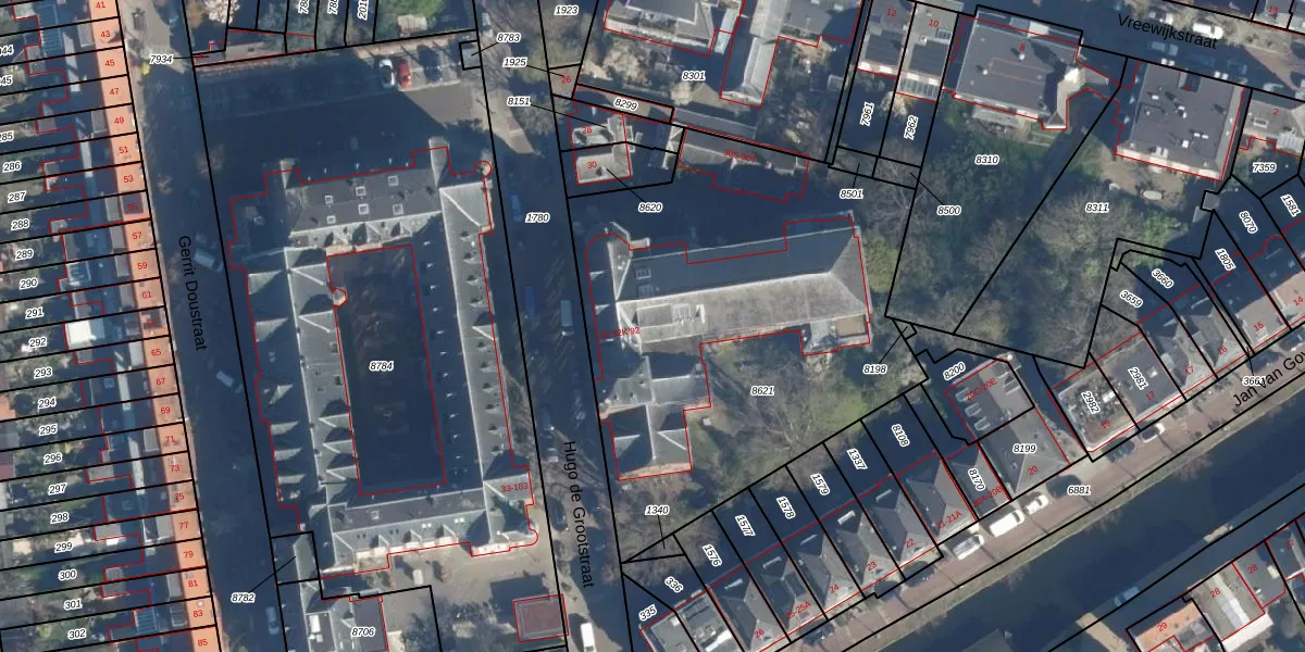 Het perceel waarop het adres ligt is LDN01-M-8621. De afkorting 'LDN01' staat voor kadastrale gemeente Leiden. De oppervlakte van het perceel is 2326 m². Dat is groter dan gemiddeld in Leiden, waar de gemiddelde perceeloppervlakte op 703,94 m² ligt. De grootste perceeloppervlakte in de kadastrale gemeente is 51,8 ha. De kleinste oppervlakte bedraagt 0 m². Op het perceel zijn 32 adressen aanwezig. In de Basisregistratie Kadaster (BRK) werden de grenzen van het perceel geregistreerd op 28-08-2003.