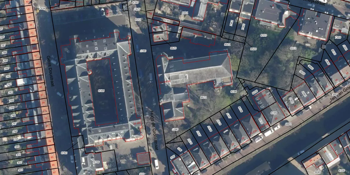 Het perceel waarop het adres ligt is LDN01-M-8621. De afkorting 'LDN01' staat voor kadastrale gemeente Leiden. De oppervlakte van het perceel is 2326 m². Dat is groter dan gemiddeld in Leiden, waar de gemiddelde perceeloppervlakte op 703,94 m² ligt. De grootste perceeloppervlakte in de kadastrale gemeente is 51,8 ha. De kleinste oppervlakte bedraagt 0 m². Op het perceel zijn 32 adressen aanwezig. De huidige grenzen van het perceel zijn digitaal in de Basisregistratie Kadaster (BRK) geregistreerd op 28-08-2003.