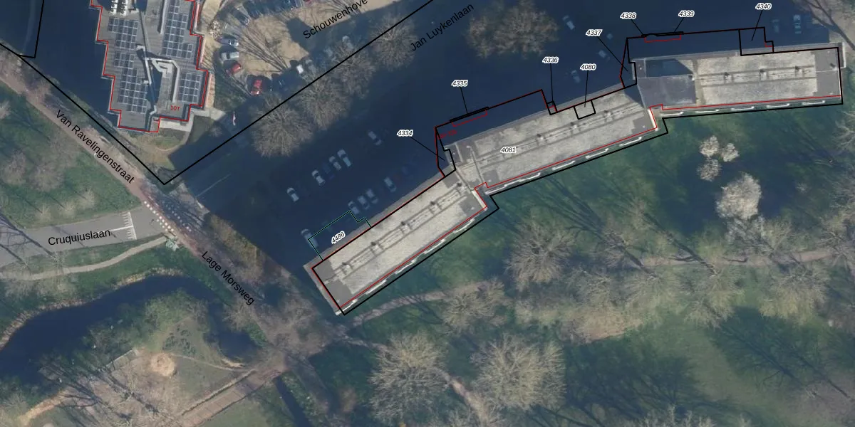 Het perceel waarop het adres ligt is LDN01-X-4081. De afkorting 'LDN01' staat voor kadastrale gemeente Leiden. De oppervlakte van het perceel is 2100 m². Dat is groter dan gemiddeld in Leiden, waar de gemiddelde perceeloppervlakte op 703,99 m² ligt. De grootste perceeloppervlakte in de kadastrale gemeente is 51,8 ha. De kleinste oppervlakte bedraagt 0 m². Op het perceel liggen in totaal 121 adressen. In de Basisregistratie Kadaster (BRK) werden de grenzen van het perceel geregistreerd op 28-05-2014.