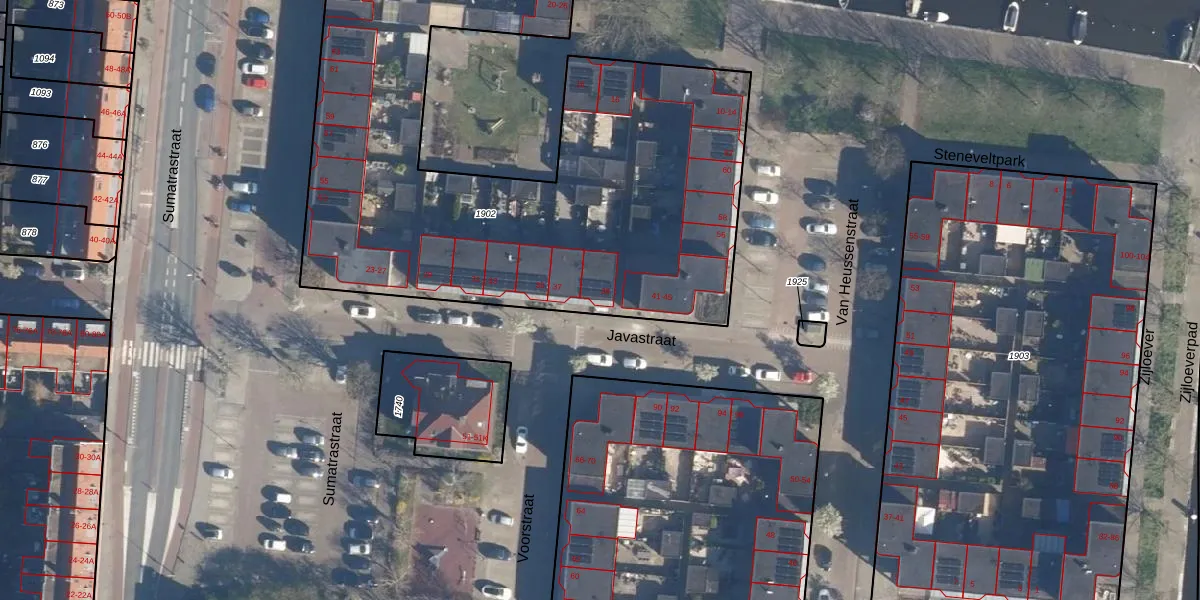 Het perceel waarop Javastraat 39 staat heeft een oppervlakte van 3334 m². Dit is een zeer groot perceel. De perceeloppervlakte wordt geregistreerd door het Kadaster. Gedetailleerde informatie over de maten van dit perceel kunt u vinden in het rapport Kadastrale kaart met maatvoering van Javastraat 39.