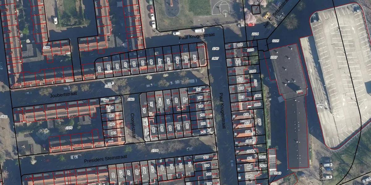 Het perceel waarop Joubertstraat 2-A staat heeft een oppervlakte van 58 m². Dit is een klein perceel. De perceeloppervlakte wordt geregistreerd door het Kadaster. Gedetailleerde informatie over de maten van dit perceel kunt u vinden in het rapport Kadastrale kaart met maatvoering van Joubertstraat 2-A.