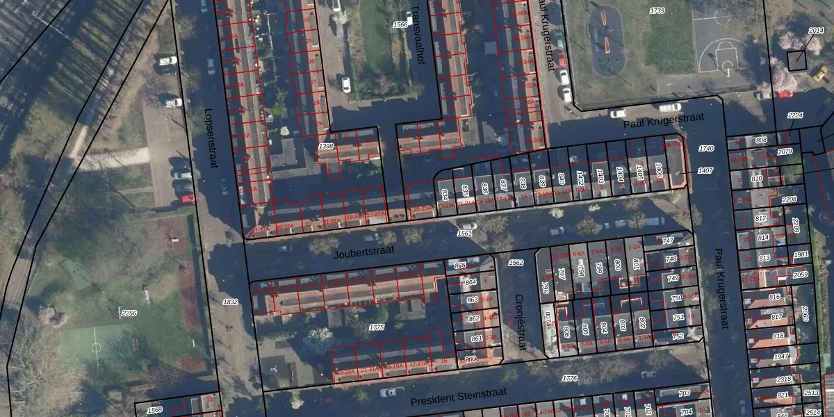 Het perceel waarop Joubertstraat 25-A staat heeft een oppervlakte van 2410 m². Dit is een zeer groot perceel. De perceeloppervlakte wordt geregistreerd door het Kadaster. Gedetailleerde informatie over de maten van dit perceel kunt u vinden in het rapport Kadastrale kaart met maatvoering van Joubertstraat 25-A.