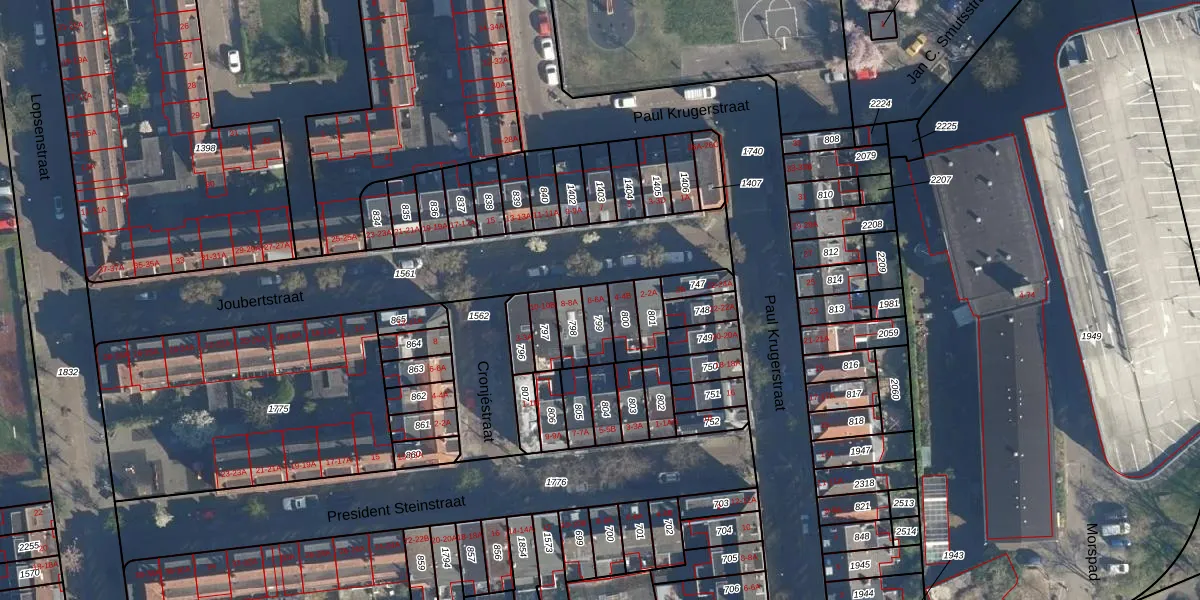 Het perceel waarop Joubertstraat 6-A staat heeft een oppervlakte van 59 m². Dit is een klein perceel. De perceeloppervlakte wordt geregistreerd door het Kadaster. Gedetailleerde informatie over de maten van dit perceel kunt u vinden in het rapport Kadastrale kaart met maatvoering van Joubertstraat 6-A.