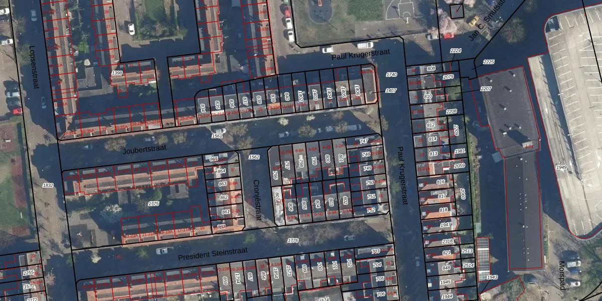 Het perceel waarop Joubertstraat 8-A staat heeft een oppervlakte van 59 m². Dit is een klein perceel. De perceeloppervlakte wordt geregistreerd door het Kadaster. Gedetailleerde informatie over de maten van dit perceel kunt u vinden in het rapport Kadastrale kaart met maatvoering van Joubertstraat 8-A.
