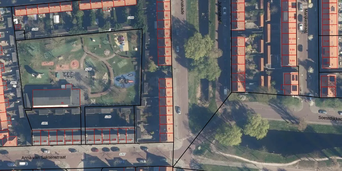 Het perceel waarop Julianakade 14 staat heeft een oppervlakte van 3100 m². Dit is een zeer groot perceel. De perceeloppervlakte wordt geregistreerd door het Kadaster. Gedetailleerde informatie over de maten van dit perceel kunt u vinden in het rapport Kadastrale kaart met maatvoering van Julianakade 14.