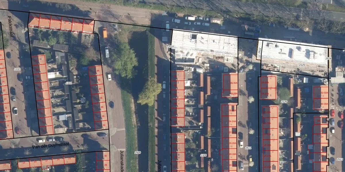 Het perceel waarop Julianakade 33 staat heeft een oppervlakte van 4918 m². Dit is een zeer groot perceel. De perceeloppervlakte wordt geregistreerd door het Kadaster. Gedetailleerde informatie over de maten van dit perceel kunt u vinden in het rapport Kadastrale kaart met maatvoering van Julianakade 33.