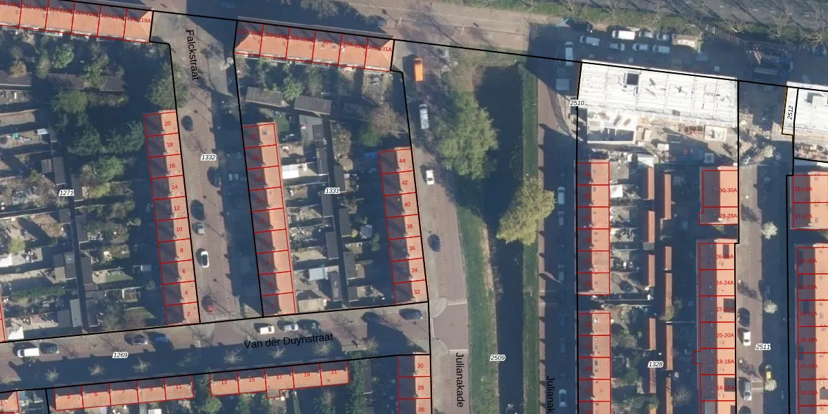 Het perceel waarop Julianakade 40 staat heeft een oppervlakte van 2710 m². Dit is een zeer groot perceel. De perceeloppervlakte wordt geregistreerd door het Kadaster. Gedetailleerde informatie over de maten van dit perceel kunt u vinden in het rapport Kadastrale kaart met maatvoering van Julianakade 40.