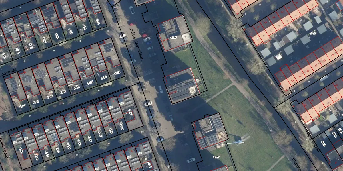 Julius Caesarlaan 100 is gelegen op kadastraal perceel LDN01T6326. Deze kadastrale aanduiding is uniek en wordt gebruikt door het Kadaster om eigendomsrechten en andere zakelijke rechten vast te leggen. Het perceel maakt onderdeel uit van de kadastrale gemeente Leiden.